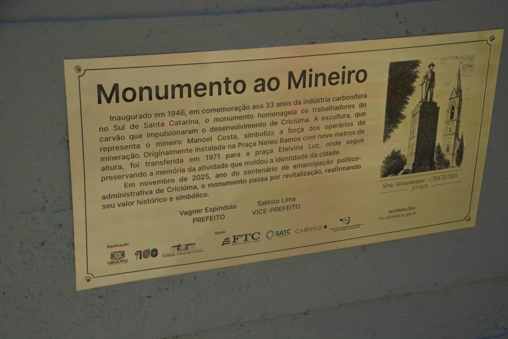 O prefeito de Criciúma, Vagner Espindola, ressaltou o valor histórico da obra e a importância de preservar a memória da mineração. “A revitalização do Monumento ao Mineiro é um gesto de respeito à nossa origem e aos trabalhadores que moldaram a cidade. A história do carvão tem capítulos de luta, crescimento e aprendizado. É simbólico devolver esse espaço ao Centro da cidade, reafirmando o reconhecimento a todos que construíram Criciúma. A memória dos mineiros, inclusive das mulheres que sustentaram suas famílias e trabalharam na escolha do carvão, segue viva e merece ser honrada todos os dias”, afirmou.